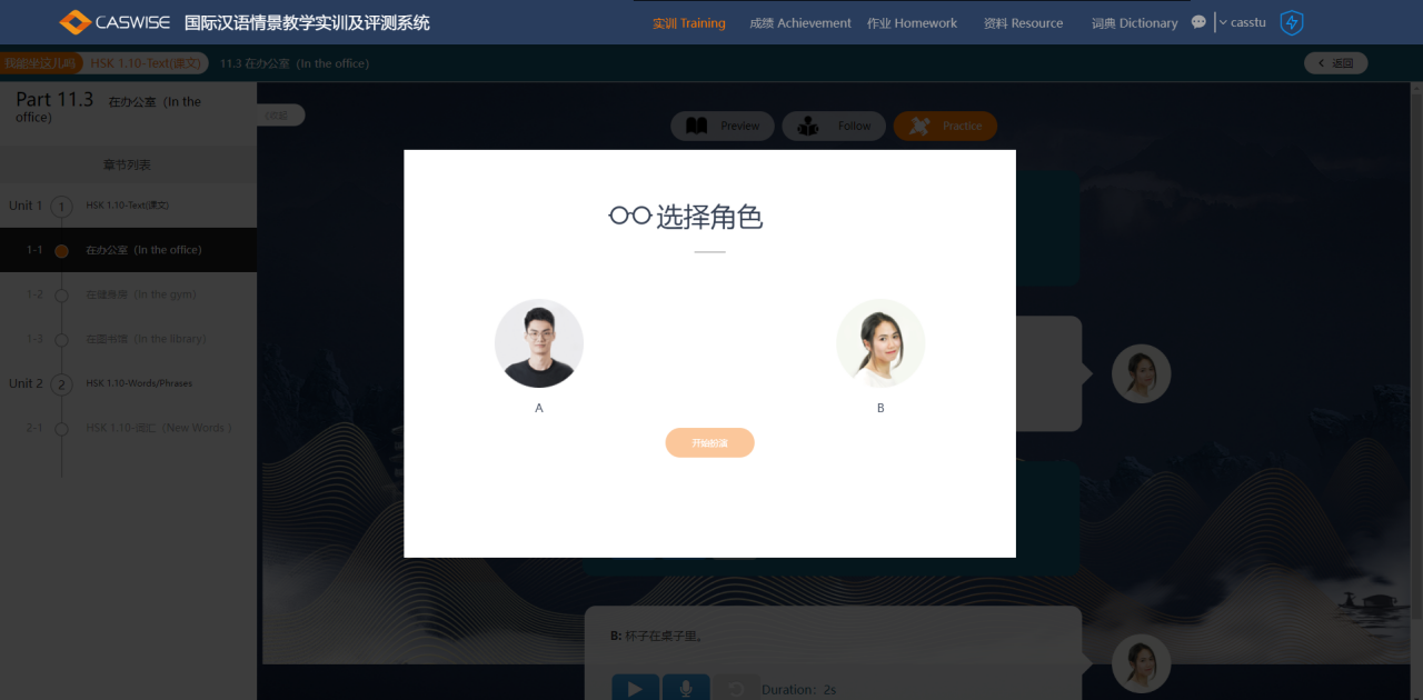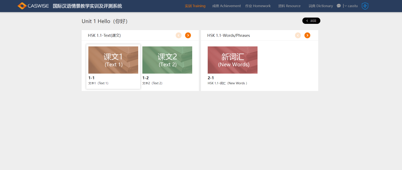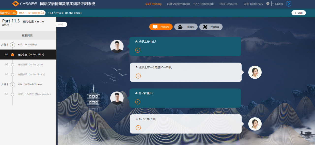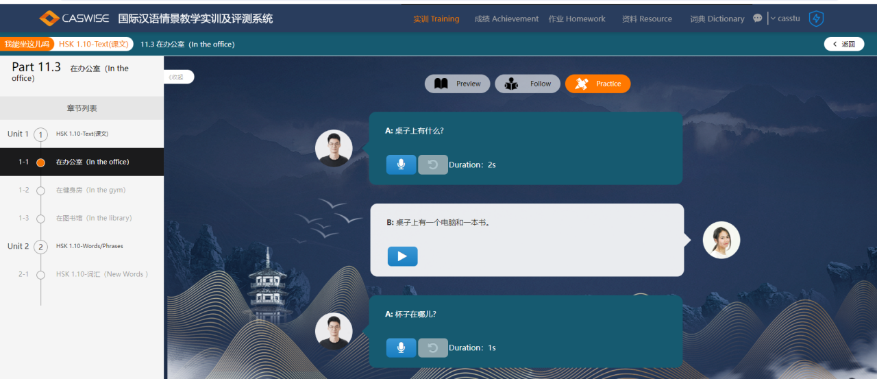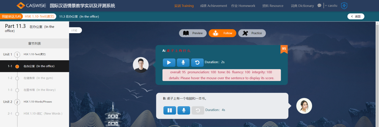 国际汉语情景教学实训系统根据场合和角色不同,提供国际汉语的语料库,主要包括:HSK标准教程第一册、HSK标准教程第二册、HSK标准教程第三册、HSK标准教程第四册,通过模拟不同环境场景,使学生感受不同的汉语氛围。系统根据场合和角色不同,提供多种类型汉语实训内容,共包含70个单元内容或者常用场景对话,每个单元课程包含新词汇训练。