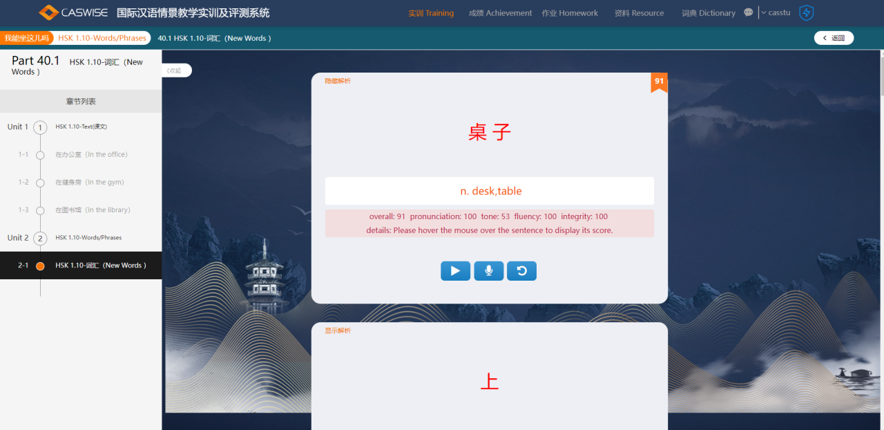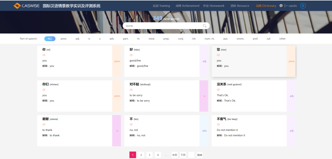 提供词典训练模块,该模块包含了课程中用的生词,采用双语进行标识,可以词汇的学习。