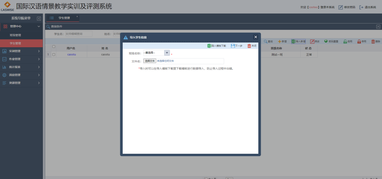 系统采用B/S结构,不需要安装客户端,满足学生随时随地进行学习的需求。三种用户角色,管理员、教师和学生,不同角色提供不同功能和页面展示。教师可以对学生、班级进行管理,支持批量添加学生账号,同时支持excel导入功能。