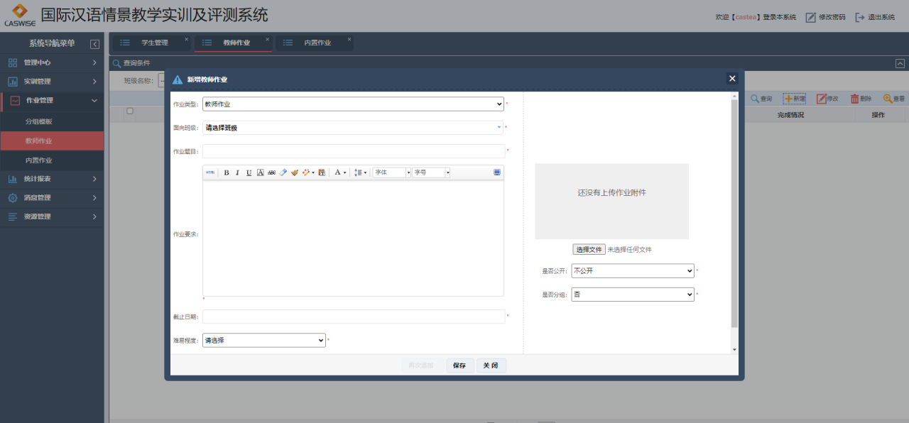教师可以在后台添加作业,学生在前台查看和完成作业(可以输入文本和提交附件),教师可以对作业进行评价和评分,对已经提交的作业,在教师还未批改评分前,学生都可以重新修改再次提交,学生可以随时查看自己曾经提交的作业内容以及教师的批改点评。