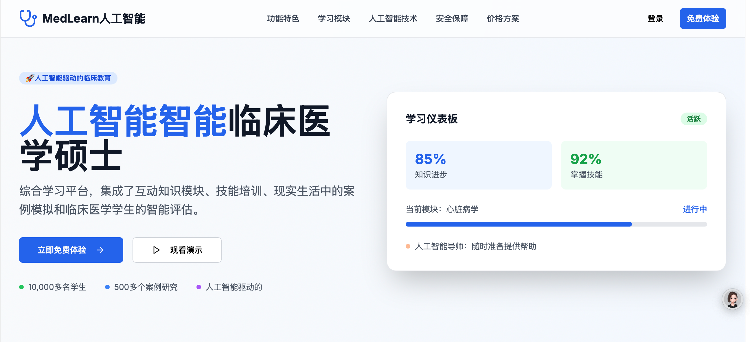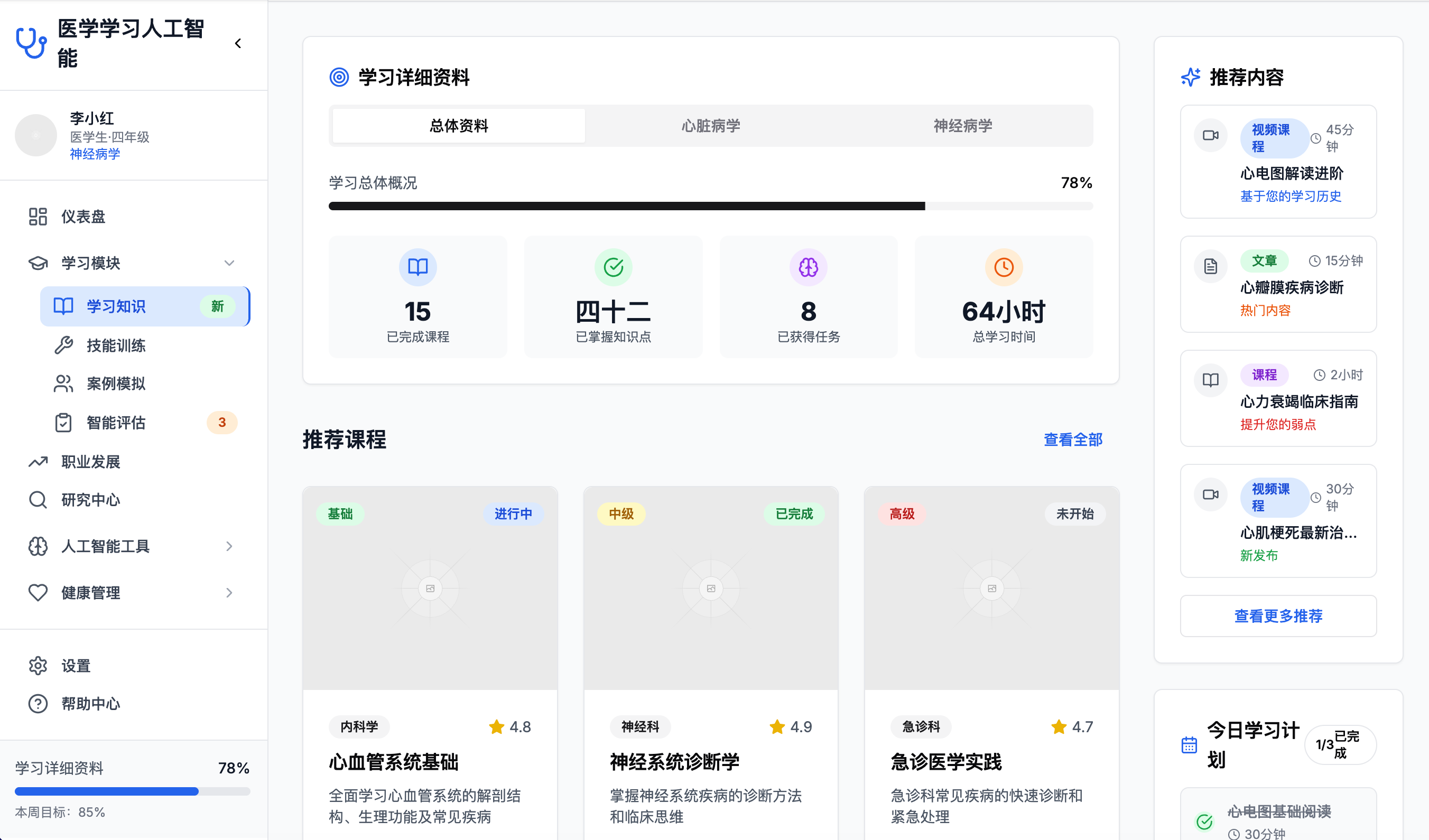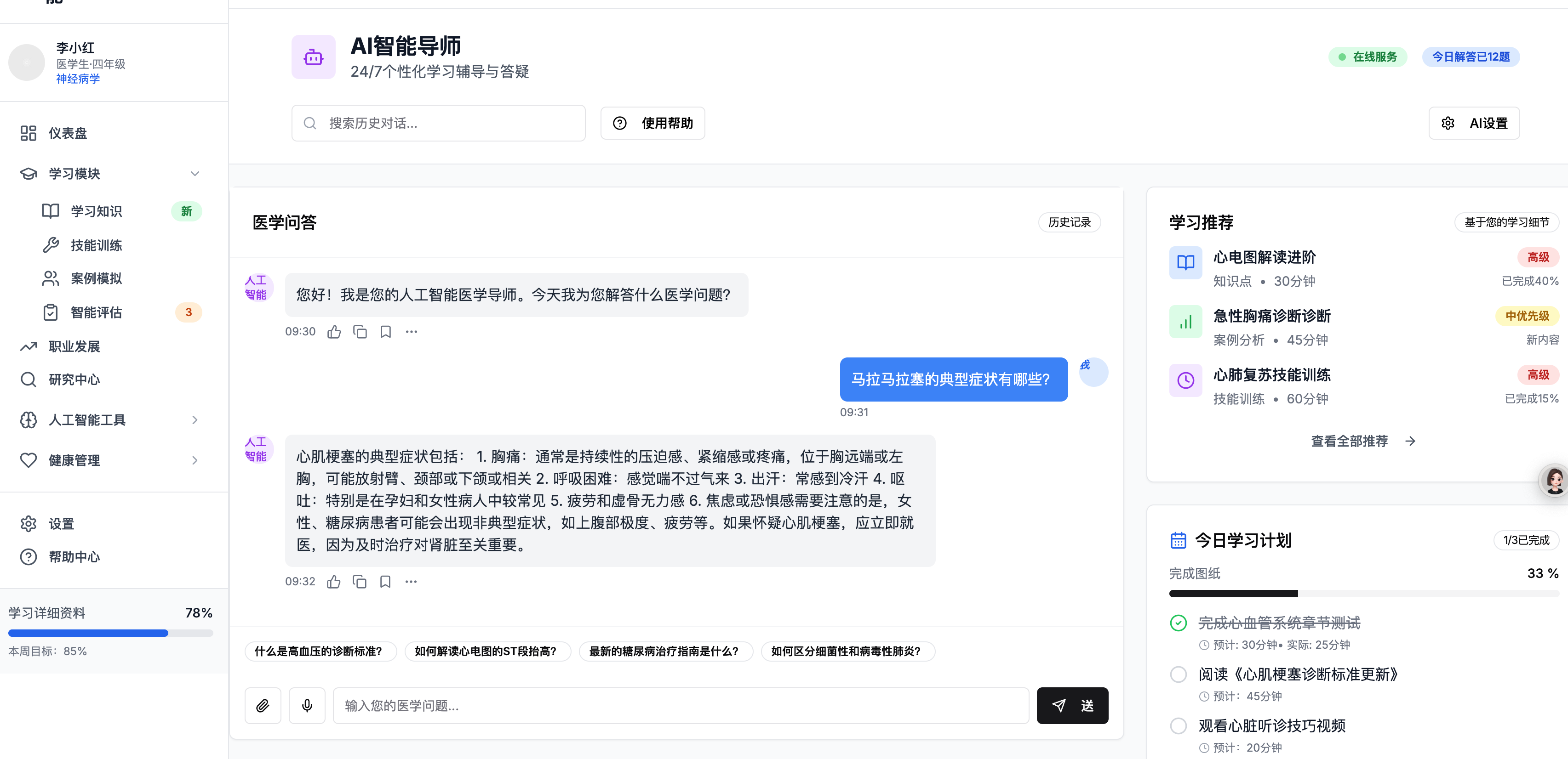 功能概述:提供医学知识库,涵盖基础理论、最新临床进展及治疗方案,平台通过AI技术智能推荐学习内容并提供个性化学习路径。