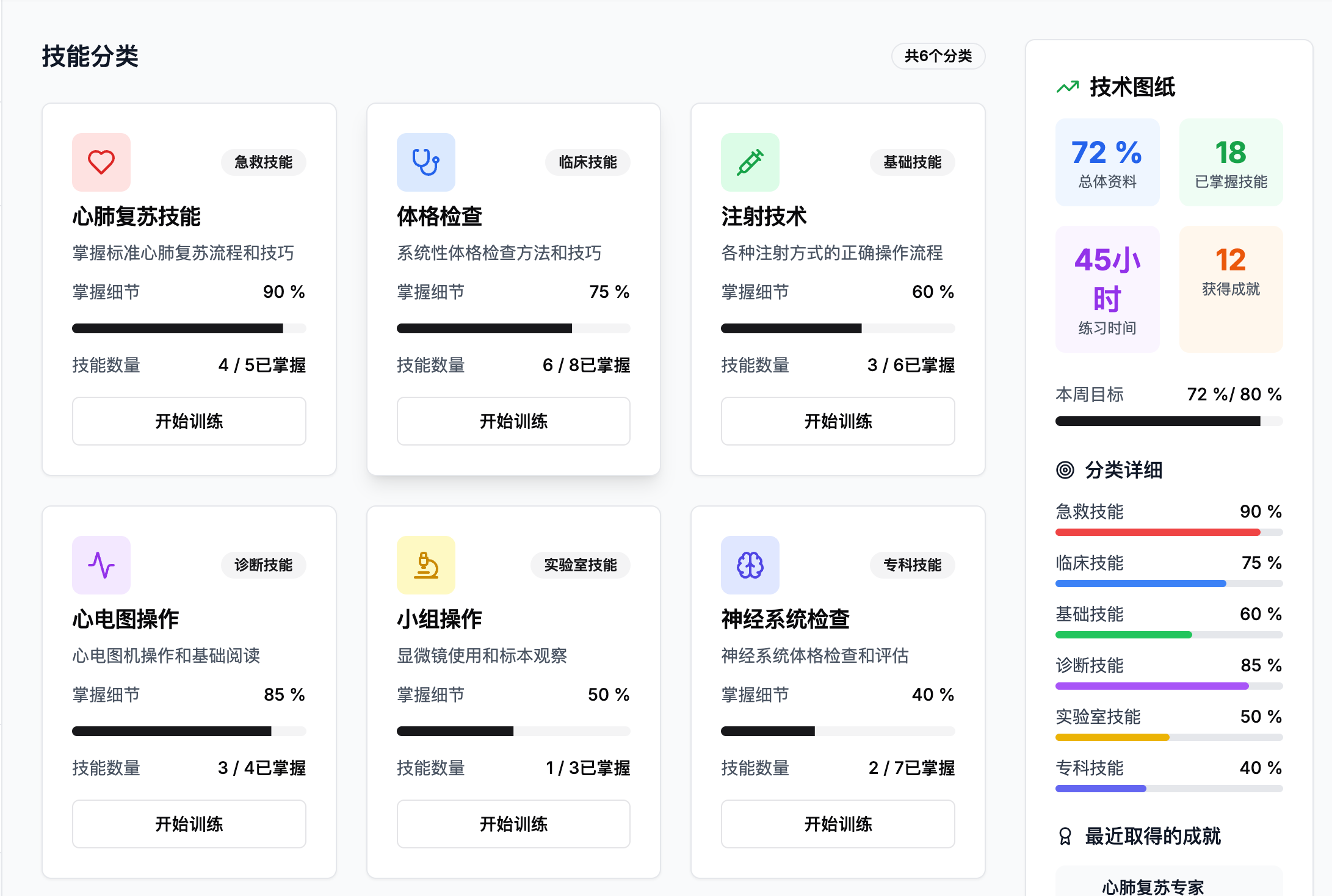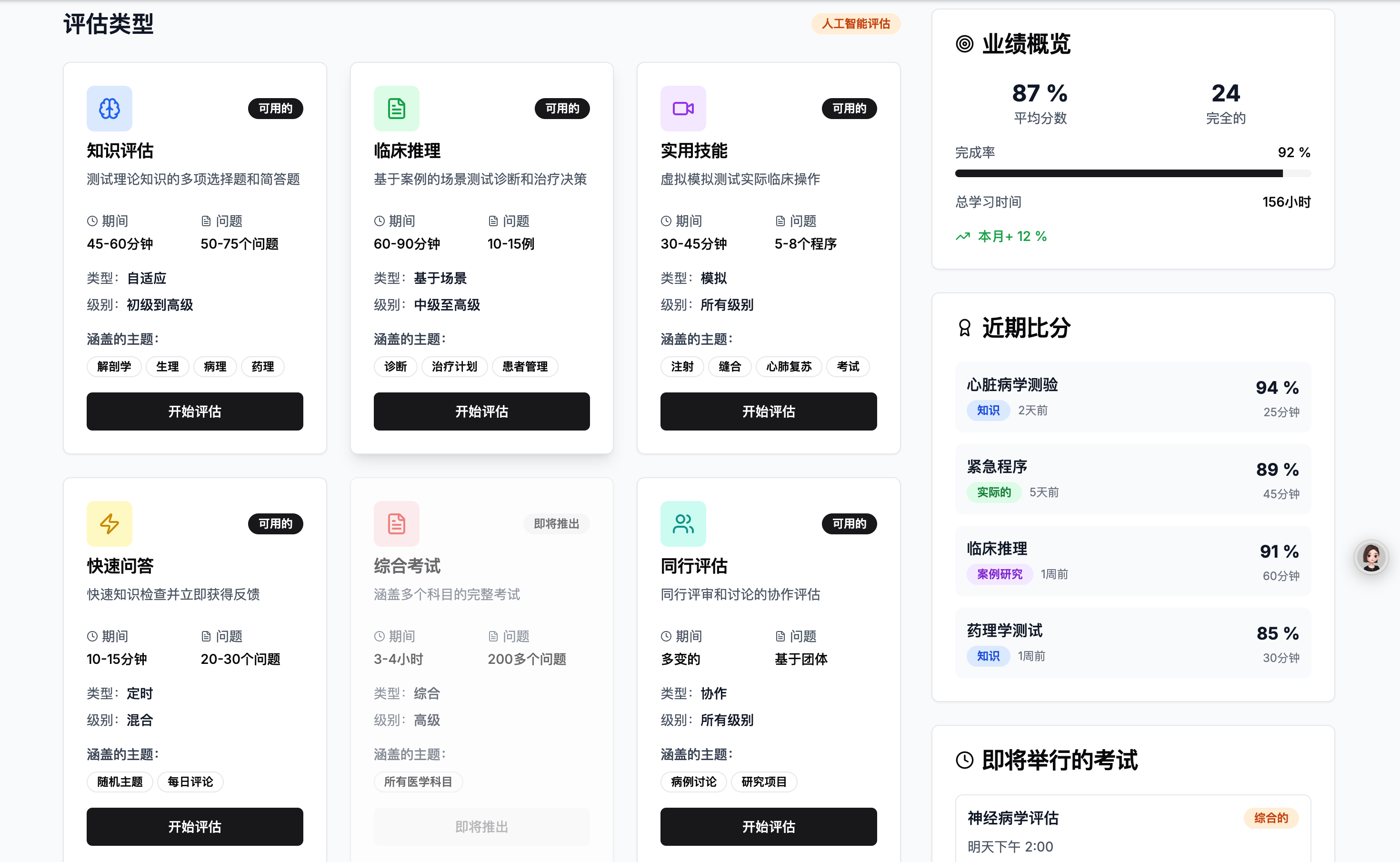 多维度评估标准:平台不仅评估知识掌握情况,还包括临床思维、沟通能力、临床操作能力等多维度的量化评估。