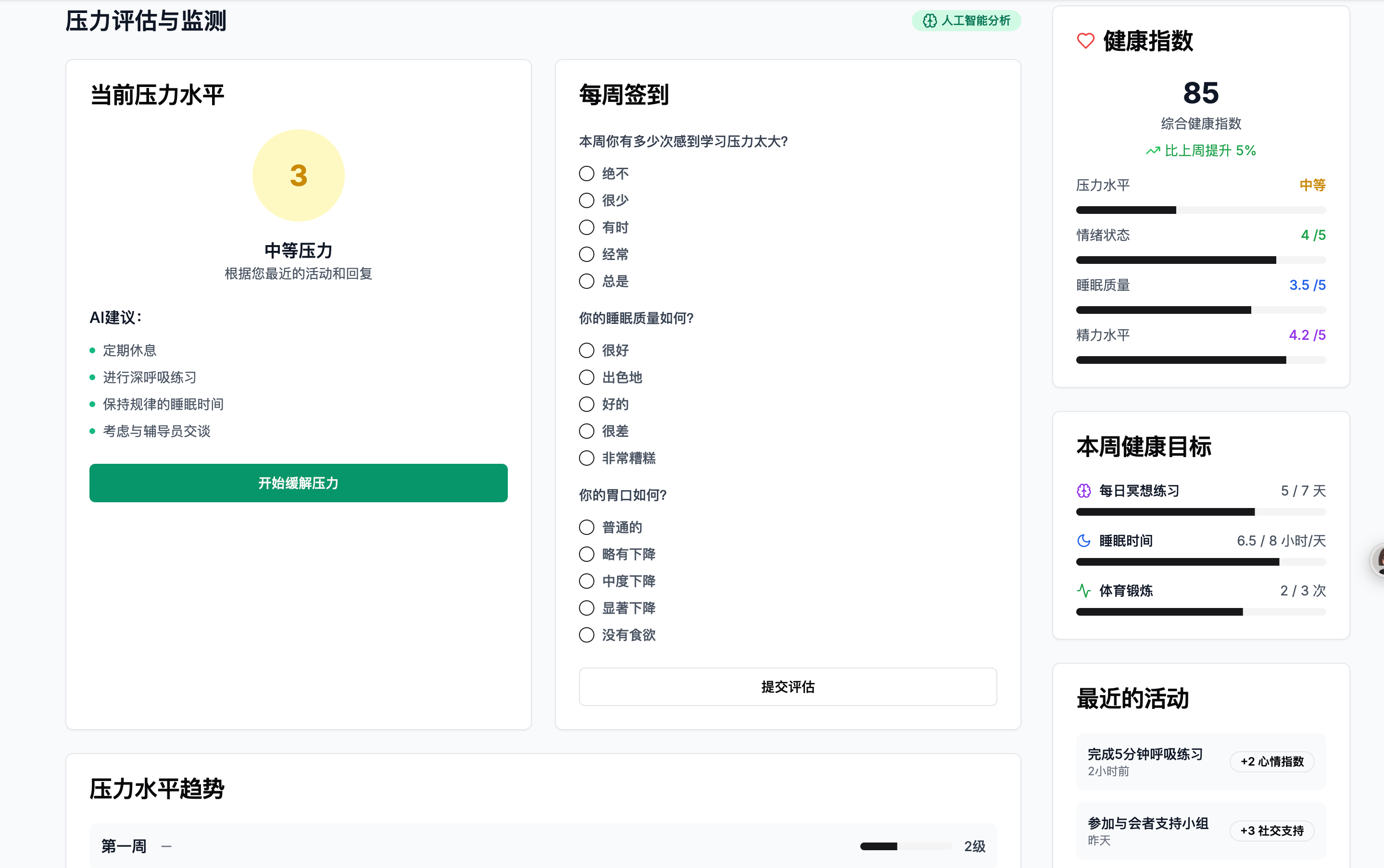 AI心理评估:通过心理测试,实时评估学生的心理健康状况,识别焦虑、抑郁等问题。