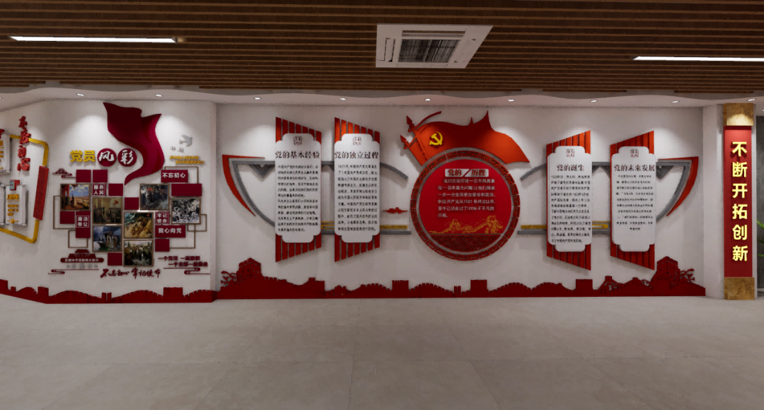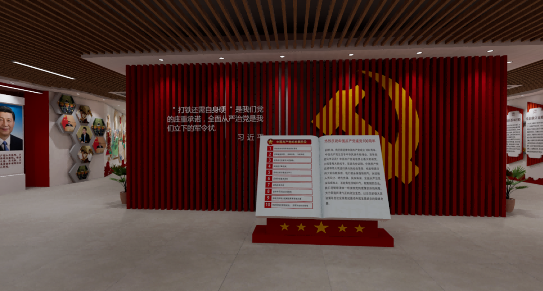 此内容为一款主要针对建党百年的VR体验产品,集成了虚拟现实技术、三维全景、三维建模、仿真引擎等高科技技术的产品。 体验者可以使用该内容学习【十个坚持】、【党的历程】、【共筑中国梦】、【入党誓词】【发挥优良传统 牢记职责使命】【领导人风采】【中国共产党的发展阶段】【五心好党员】等8个大类板块,通过智能语音系统、虚拟仿真引擎、三维模拟等技术,引导体验者体验多个主体板块内容。