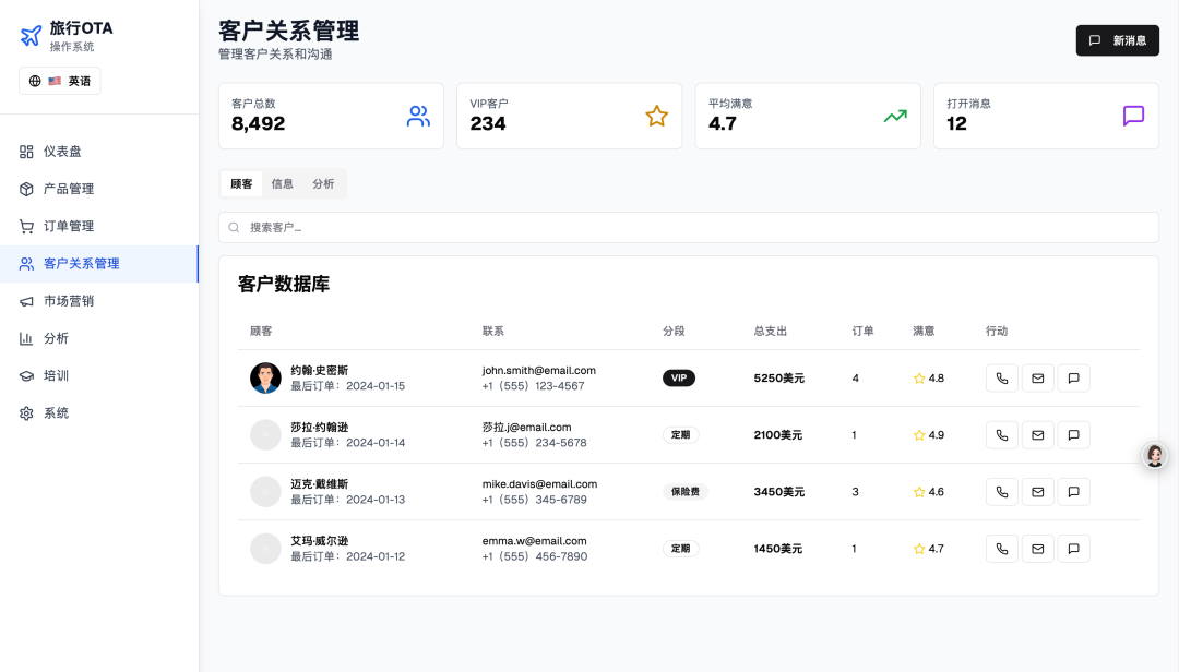 高效的客户关系管理(CRM)是提升客户满意度与忠诚度的关键,旅行社OTA运营实训系统通过AI与大数据分析,帮助用户深入管理客户信息: