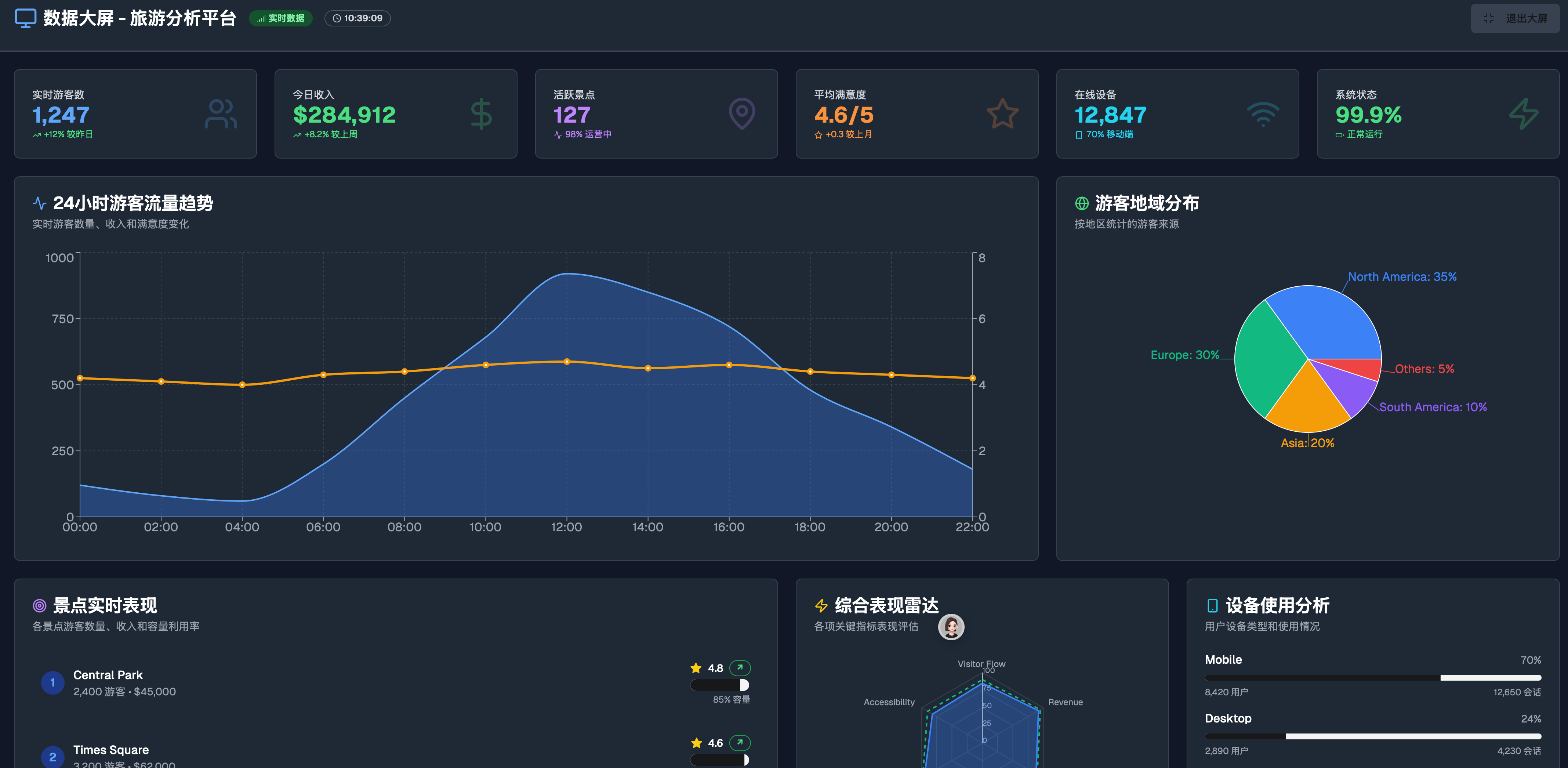 实时数据可视化:展示实时游客流量、热门景点与客户评价等数据,帮助管理者把握旅游行业动态。