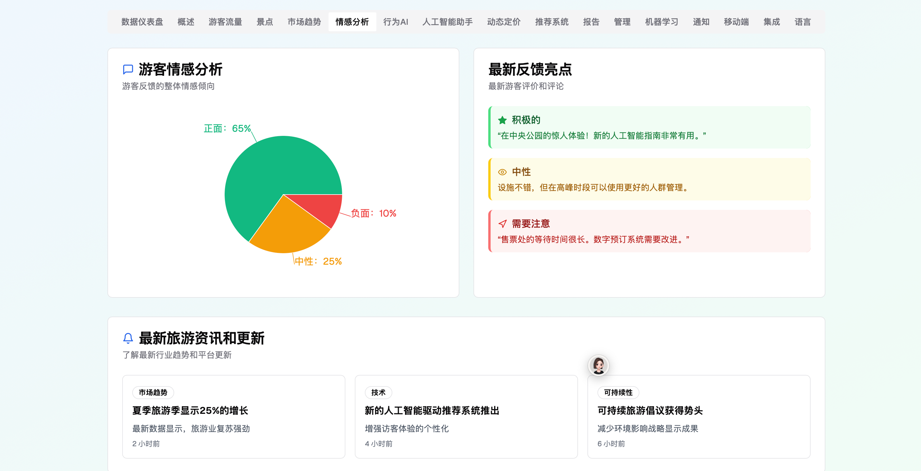 智能情感分析:对游客评论与社交媒体内容进行情感分析,帮助企业识别正负面反馈,优化服务质量。