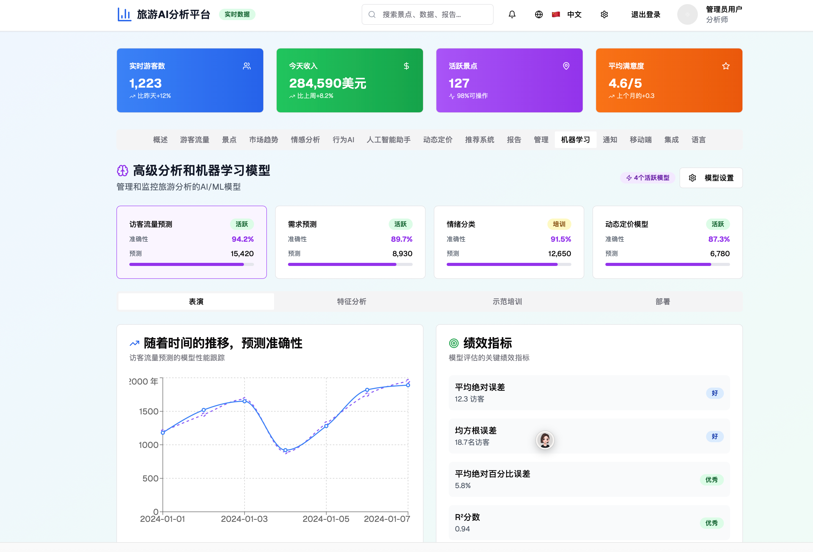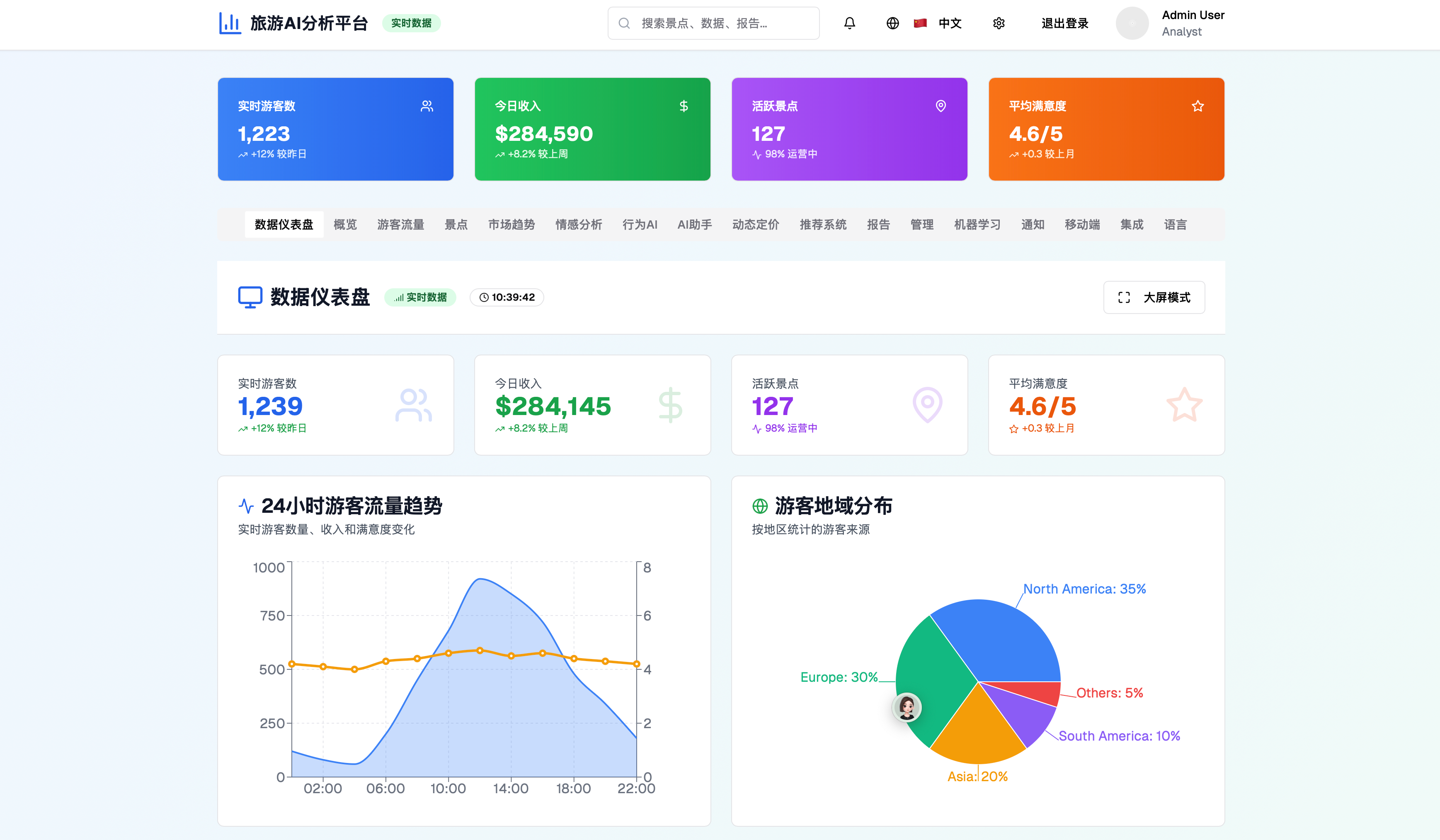 随着国家“十四五”规划中的“数字经济发展规划”及《文化和旅游部关于推动智慧旅游创新发展的指导意见》的发布,旅游产业正在快速迈向数字化、智能化时代。特别是随着人工智能(AI)、大数据、云计算等技术的不断进步,旅游行业的数字化转型正在成为行业发展的核心驱动力。为了响应国家政策对旅游数字化转型的需求,基于AI与大数据的旅游数据分析平台应运而生,致力于通过数据驱动实现精准管理与决策,为旅游企业和政府机构提供智能化支持,助力智慧旅游生态的发展。