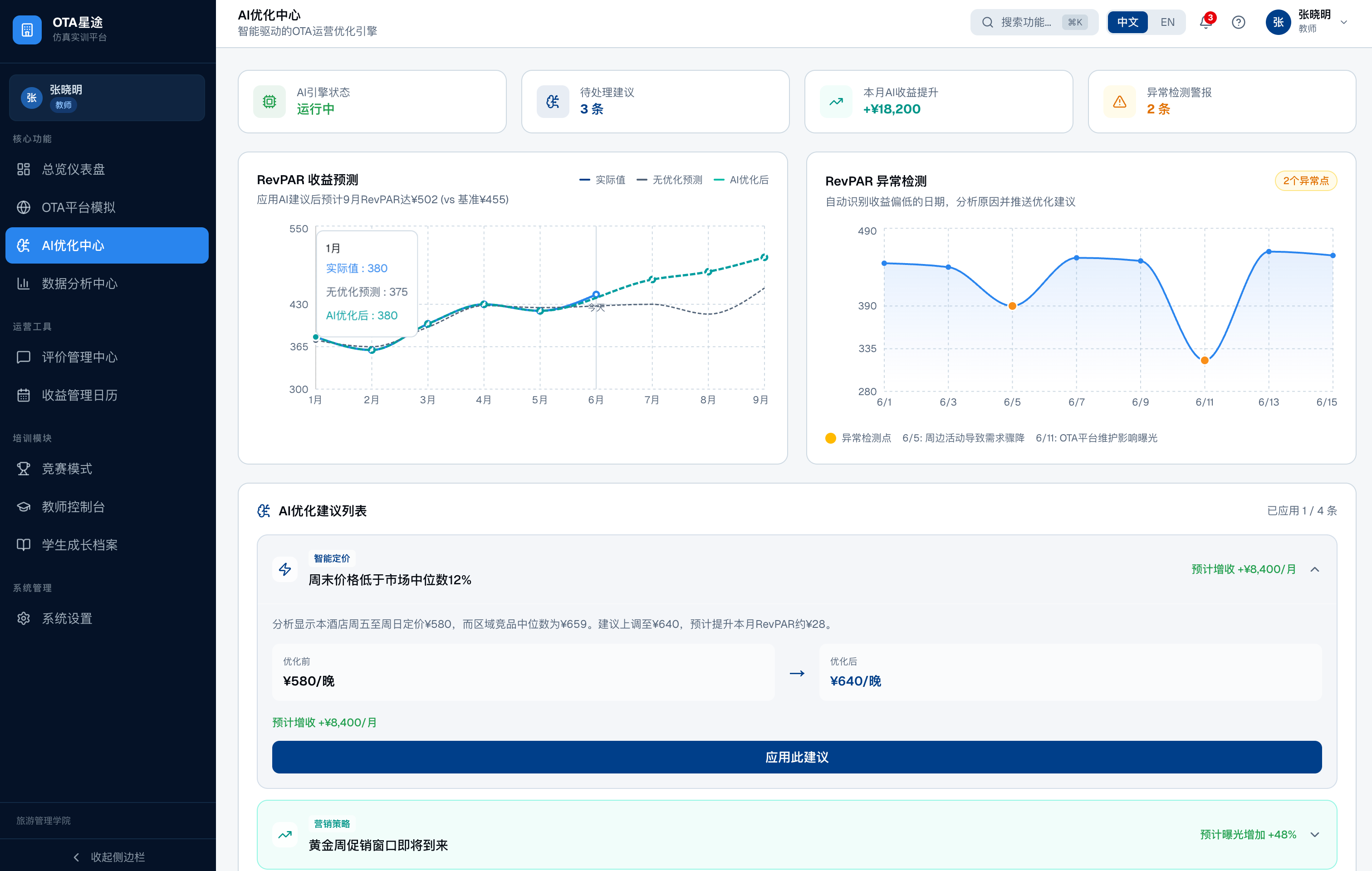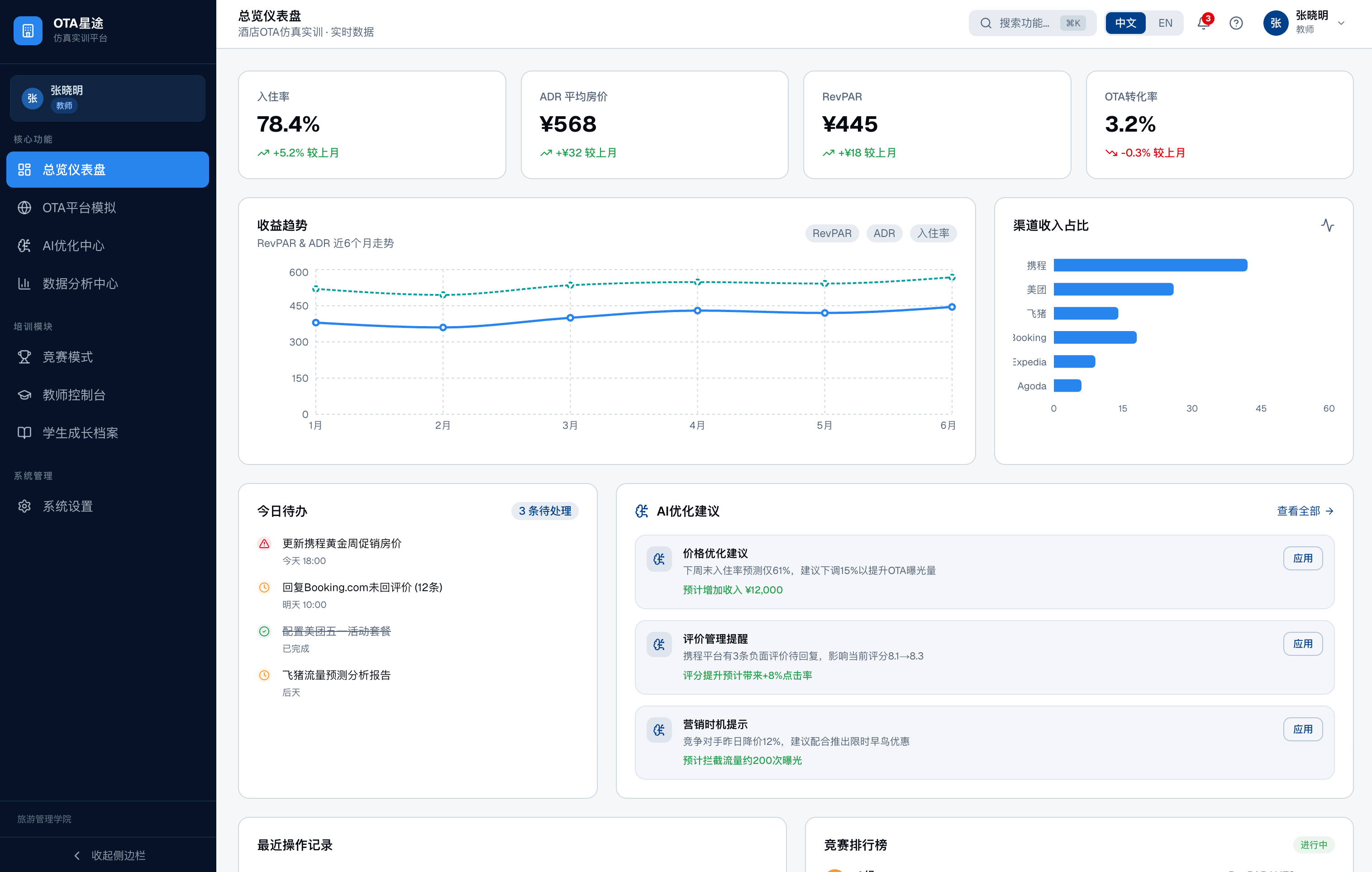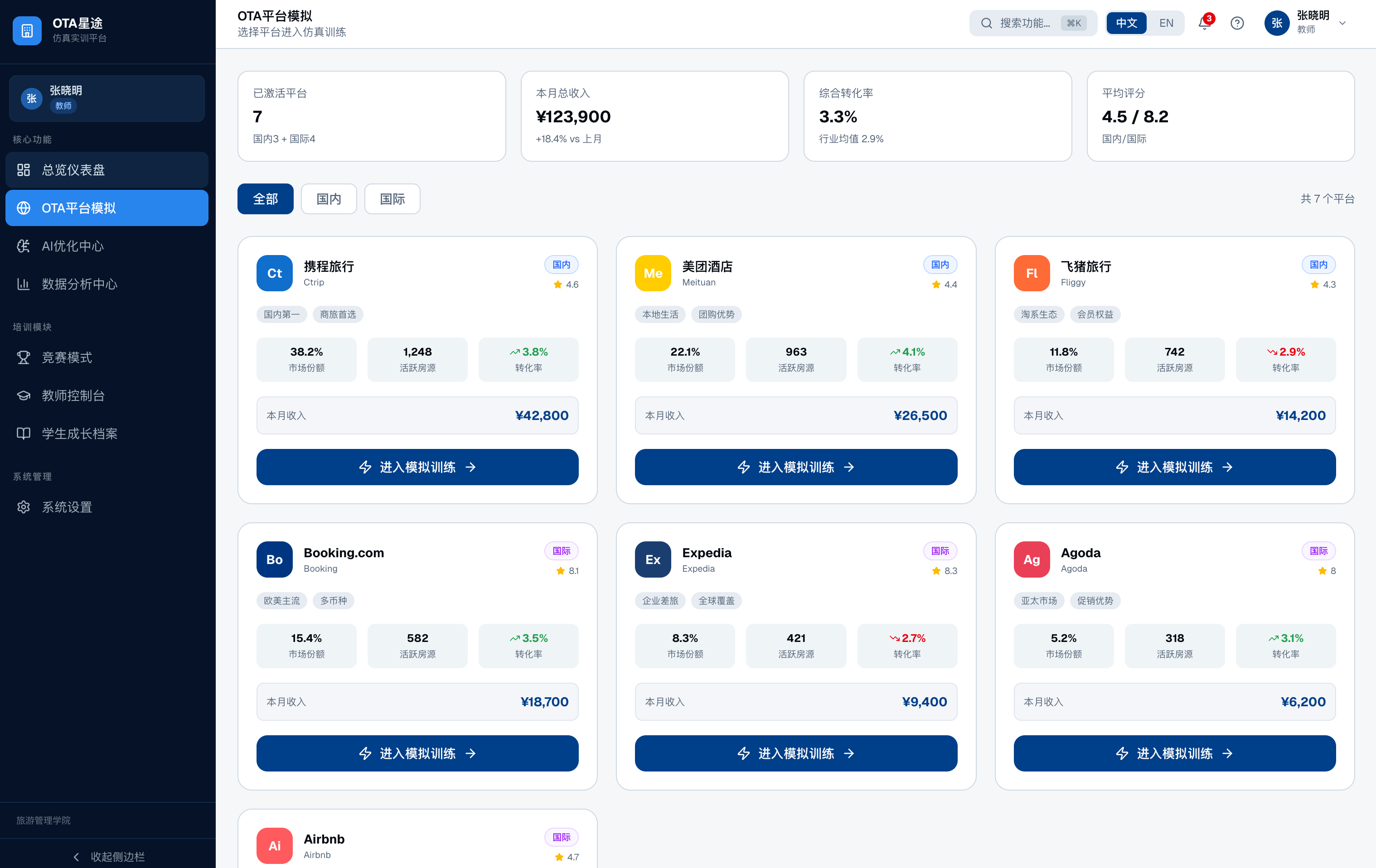 本平台面向酒店管理、旅游管理、智慧文旅、数字营销、收益管理等专业,构建一个融合: